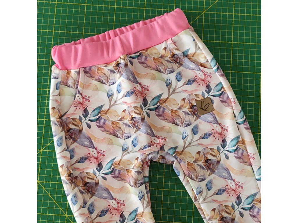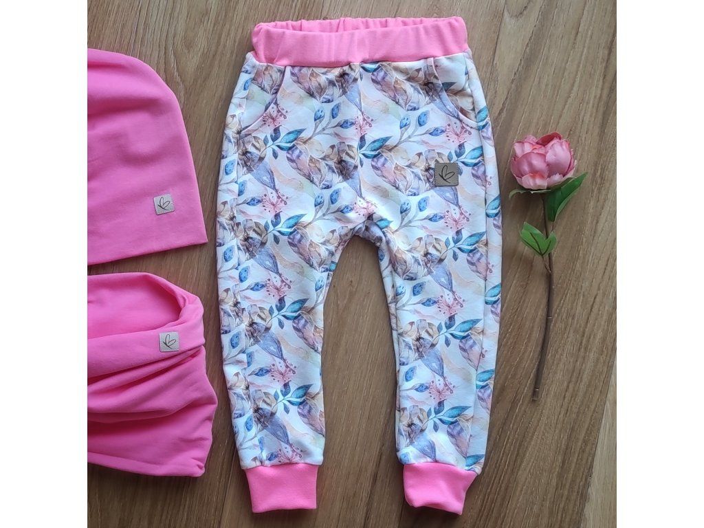 Pohodlné tepláčky s květy v jemných tónech v kombinaci s růžovými manžetami ve vel. 86/92, ve vel. 98/104 se zelenkavými manžetami.